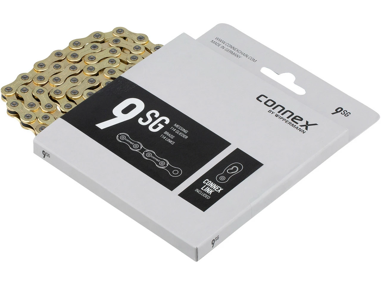 Das goldfarbene Erscheinungsbild und die hochwertige Messingbeschichtung der Connex 9sG bietet einen zuverlässigen Korrosionsschutz. Die extrem ausgeformten Außenlaschen der Connex 9sG versprechen eine langlebige Kraftübertragung. Durch das im Lieferumfang enthaltene Connex Link Kettenschloss (de-)montierst Du die Kette werkzeuglos im Handumdrehen.