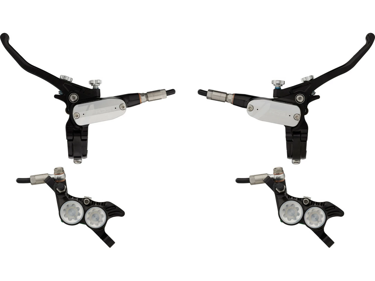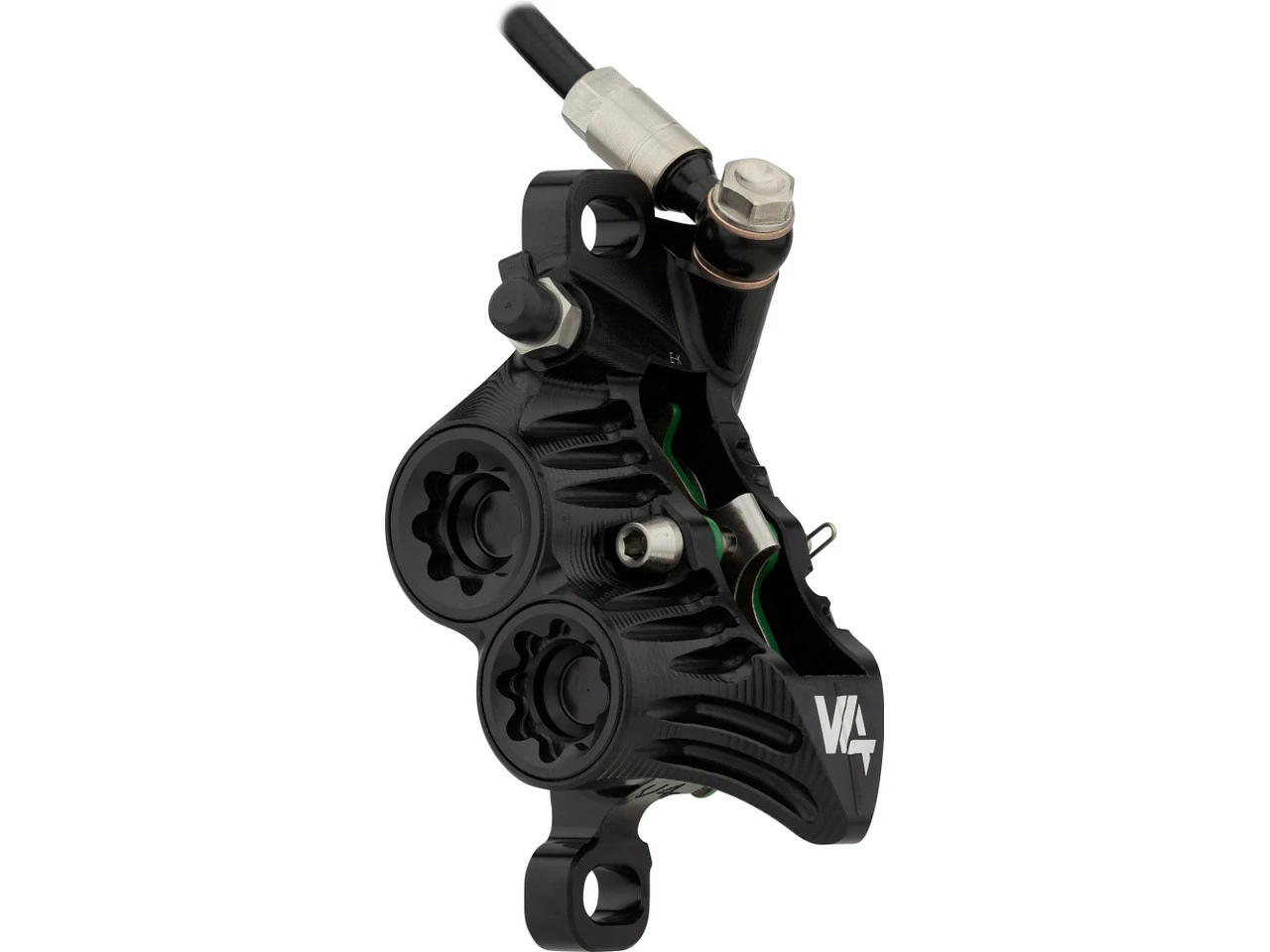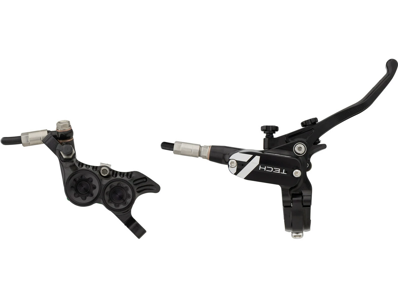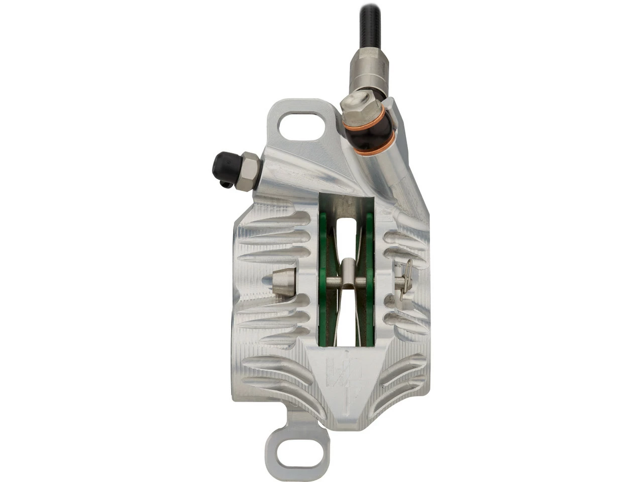 Spezifikationen:Einsatzbereich:Downhill, Dirtjump & SlopestyleBremsentyp:hydraulisch, 4-KolbenBremsmedium:DOT 5.1Leitung:KunststoffLeitungslänge VR/HR:1600 mmTechnische Daten Bremssattel:Montage Bremssattel:PostmountBremsbelag:Racing Organic Grade ResinBauweise:einteiligMaterial Bremssattel:AluminiumMaterial Kolben:Edelstahl, PhenolLeitungsanschluss:BanjoTechnische Daten Bremsgriff:Hebellänge:1-FingerEinstelloptionen:Griffweiteneinstellung, DruckpunktMontage:Klemmschelle (geteilt)Bauart:rechts (seitenspezifisch), links (seitenspezifisch)Material Bremshebel:AluminiumMaterial Bremsgriffgehäuse:AluminiumLeitungsanschluss:GeradeFeatures:hohe Bremspower für Bremsscheiben mit bis zu 220 mm DurchmesserPhenol-Einsätze in den Kolben und Kühlrippen am Sattel verhindern Überhitzungweiterentwickelte Technik mit deutlich mehr Druck verglichen mit Tech 3CNC-gefräster einteiliger BremssattelRollenlagerung im Hebelmechanismus verringert ReibungDruckpunkt und Hebelweite werkzeugfrei jederzeit anpassbarergonomische Hebelform für besseren Grip und weniger Ermüdungserscheinungenverstellbarer Hebelwinkelgeteilte Klemmschellekürzbare KunststoffleitungHinweis des Herstellers:Der V4 Bremssattel ist aufgrund seiner Bauweise