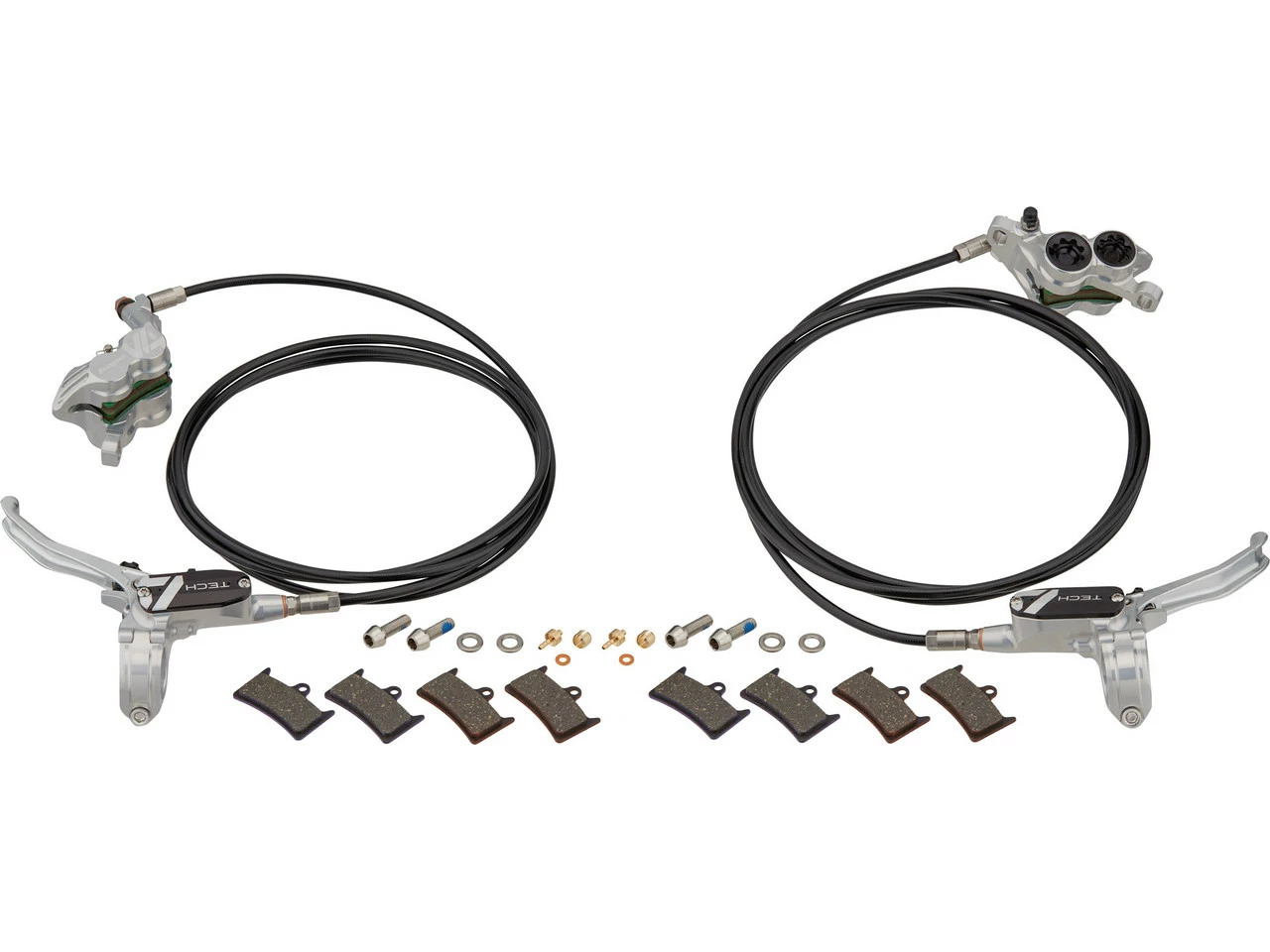 Lieferumfang:2 x Scheibenbremse Hope Tech 4 V4, montagefertig befüllt und entlüftet2 x Bremsleitung Kunststoff 1600 mm2 Paar Bremsbeläge Hope Racing (montiert)2 Paar Bremsbeläge Hope All Conditions2 Paar Bremsbeläge Hope E-Bike4 x Schraube Innensechskant4 x Unterlegscheibe groß2 x Olive2 x Insertpin2 x Unterlegscheibe klein