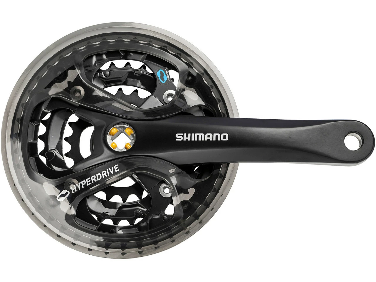 Die Shimano Acera FC-M361 ist eine Vierkant-Kurbelgarnitur für 7- oder 8-fach Antriebe. Sie kommt mit drei Kettenblättern (104 bzw. 64 mm Lochkreis, 4-Arm) und einem Kettenschutzring. Auf beiden Aluminium-Kurbelarmen ist ein schickes Shimano Logo angebracht. Die FC-M361 kann mit einem Kettenkasten verwendet werden und integriert sich perfekt in das HyperDrive-System der vorderen Antriebskomponenten.
