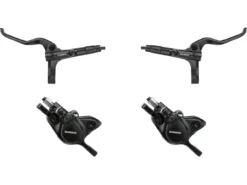 Das Shimano BR-MT200 + BL-MT201 Scheibenbremsenset (VR + HR) versorgt den Fahrer mit einer Bremsleistung, die an das Niveau von MTB-Einsteigern angepasst ist. Es eignet sich aber auch für den Einsatz am Trekking- oder City-Bike. Die beiden 2-Kolben-Bremssättel arbeiten zuverlässig und weitgehend geräuscharm und lassen sich per One Way Bleeding ganz einfach entlüften. Auf der Geberseite befinden sich zwei 3-Finger-Bremshebel, deren Griffweite mit einem Werkzeug angepasst werden kann. So lässt sich auch für kleinere Hände eine bequeme Einstellung der Bremsgriffe finden.