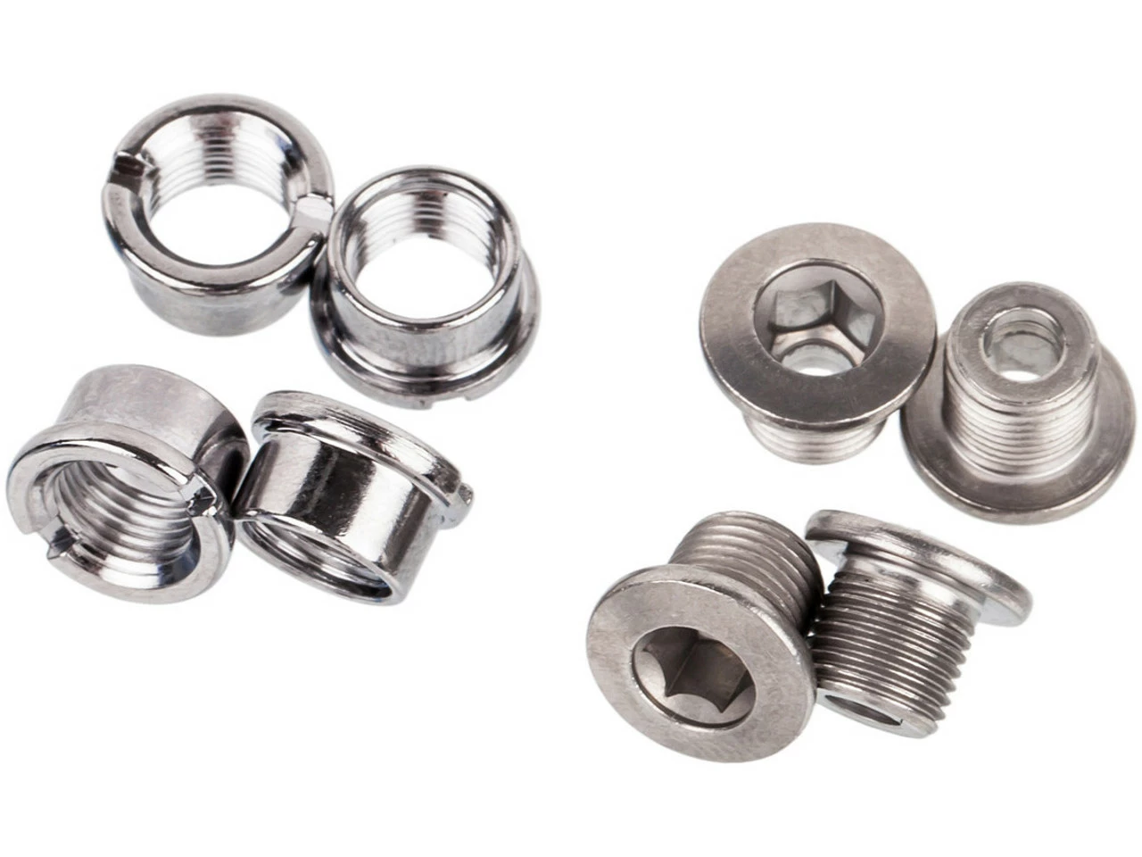 Diese Shimano Kettenblattschrauben sind kompatibel mit der Deore Kurbelgarnitur FC-M615 und anderen 4-Arm Kurbeln. Sie haben ein M8 x 7 mm Gewinde. Vier Kettenblattmuttern werden mitgeliefert.