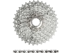 Spezifikationen:Einsatzbereich:Cross Country, Touring & TrekkingSchaltstufen:9-fachFreilaufkompatibilität:Shimano MTBHinweis:mit 1,85 mm Distanzring kompatibel zu Shimano Road 11-/12-fachTechnische Daten Kassette:Serie:Deore XT M770Material Ritzel:StahlSpider / Ritzelträger:1 (Aluminium)Technische Daten Kette:Gliederzahl:114Verschlussart:Kettennietstift silbern (Typ Ampulle)Nietentyp:chrombeschichtet, massivLaufrichtungsgebunden:NeinMaterial:StahlFeatures:Kassette: