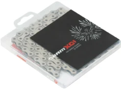 Die Kette hat eine viermal höhere (Verschleiß-) Festigkeit als die anderen SRAM-Ketten. Dies liegt an dem neuen Bearbeitungsverfahren für die inneren Glieder und Rollen. Die Push-Pin-Festigkeit und die Gesamtfestigkeit entsprechen den aktuellen SRAM-Ketten. Diese Kette hält länger und ist äußerst stabil.