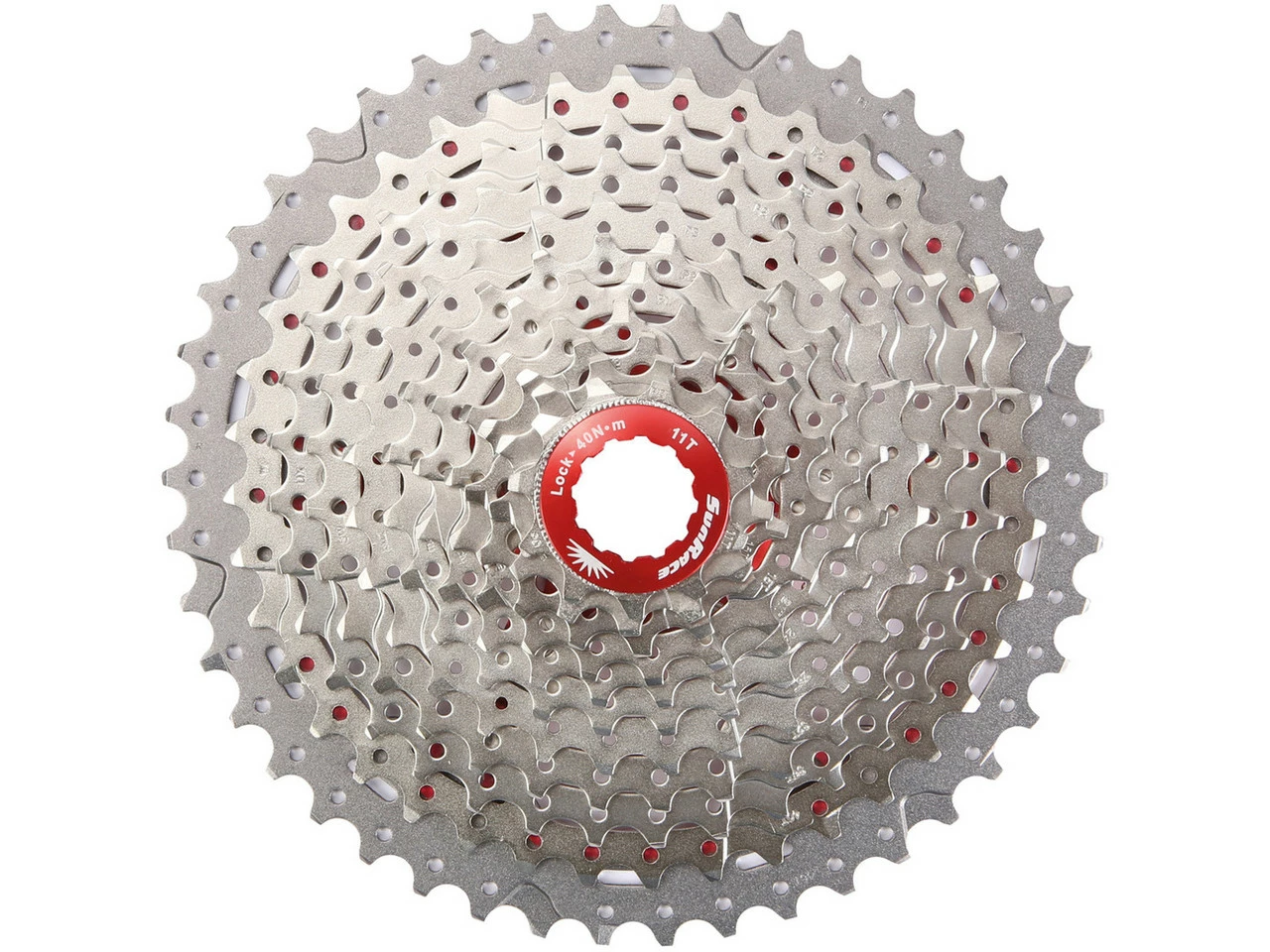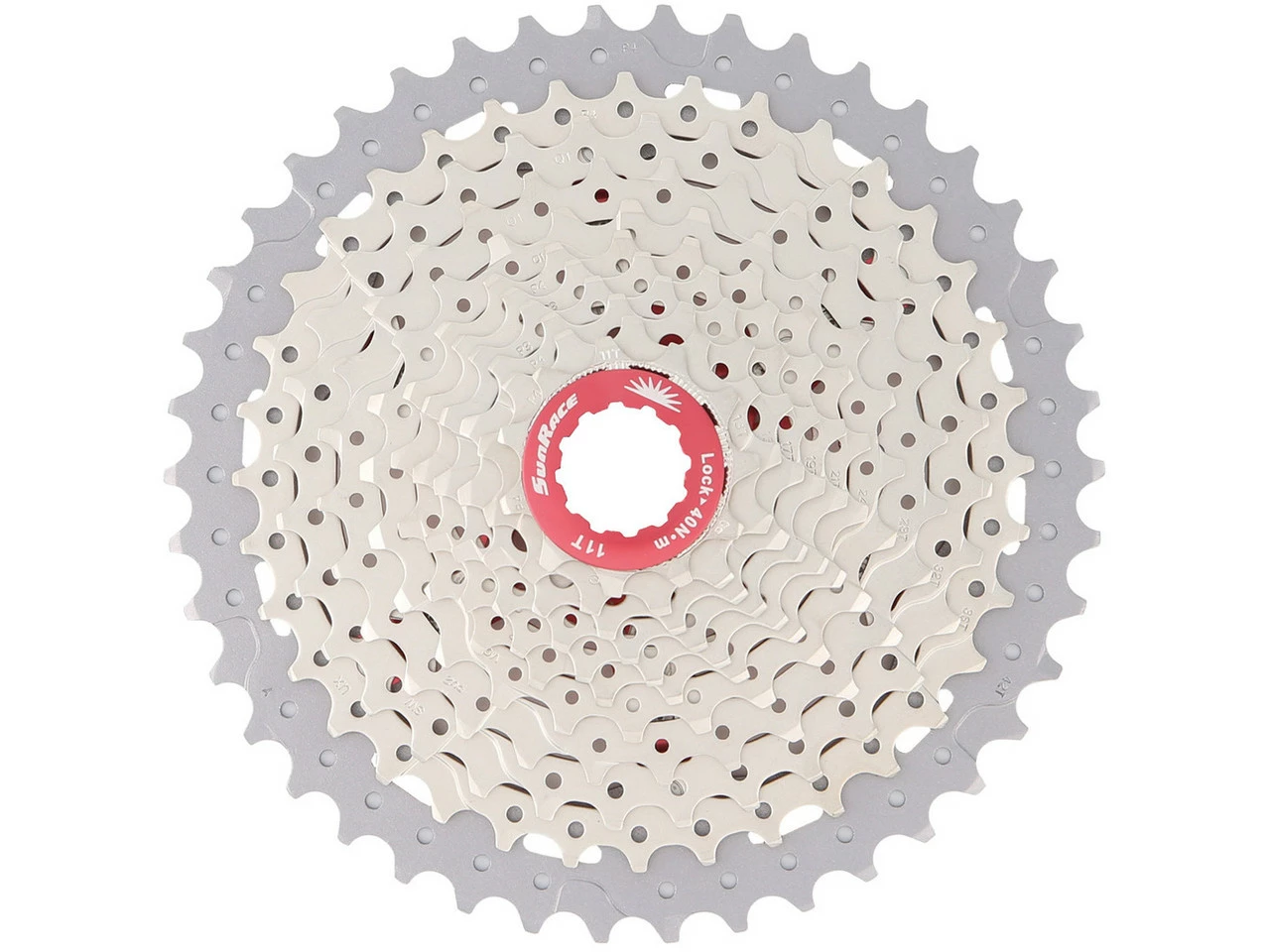 Die SunRace CSMX8 Kassette verfügt über eine große Bandbreite (11-40, 11-42 oder 11-46 Z) und begeistert mit der Fluid Drive Plus™ Technologie, welche für zuverlässige Schaltvorgänge unter allen Bedingungen steht. Das größte Ritzel wurde aus Aluminium gefertigt, alle anderen aus Stahl; deswegen ist diese Kassette trotz Loch-Designs etwas schwerer als CSMX80. Für farbige Akzente sorgen rot eloxierte Spider und der Lockring.