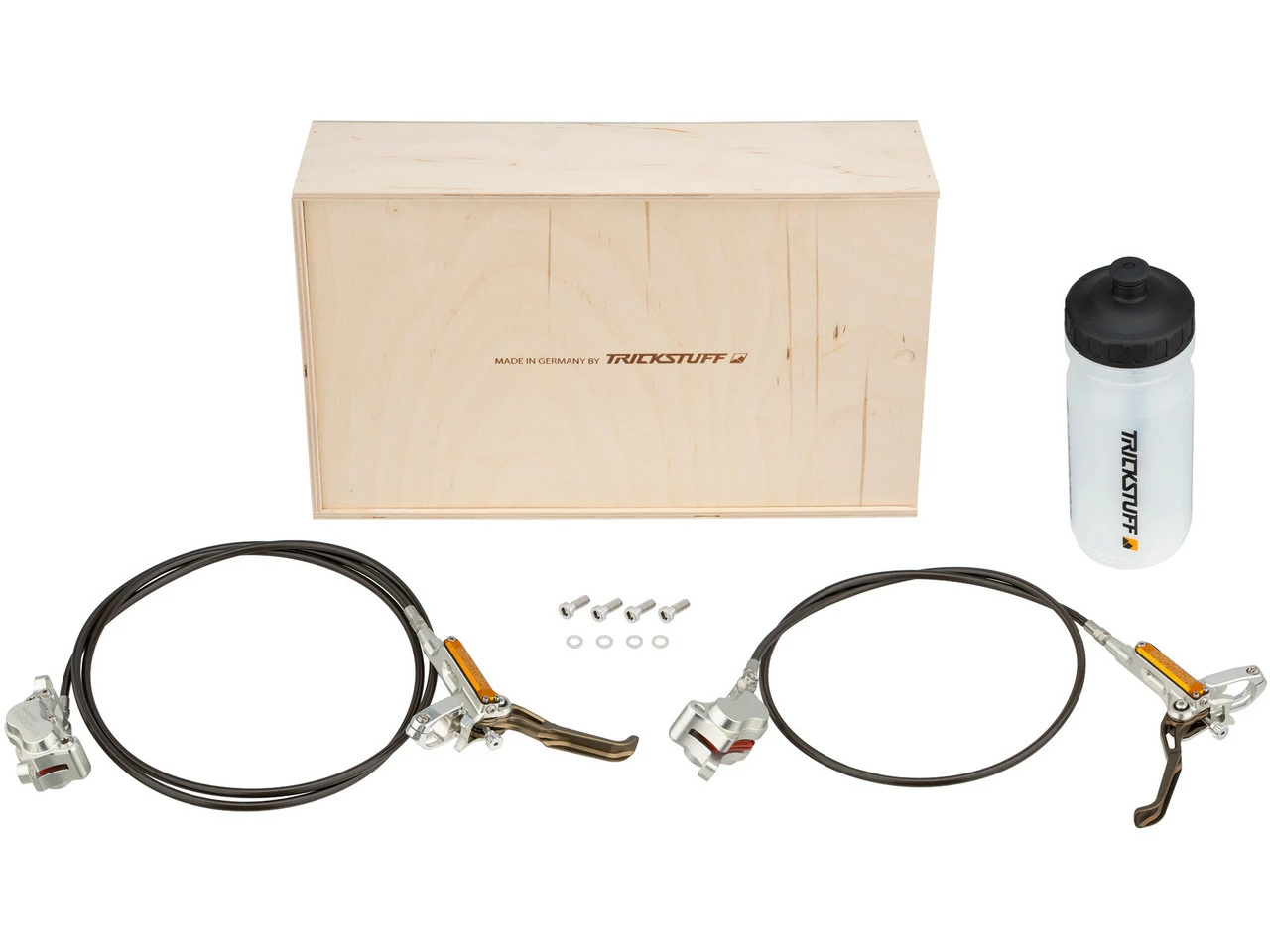 Lieferumfang:1 Paar Scheibenbremsen Trickstuff Maxima, montagefertig befüllt und entlüftet (Vorderrad und Hinterrad)2 Paar Bremsbeläge Trickstuff POWER2 x Bremsbelagssicherungsschraube Trickstuff2 Paar Bremssattelschrauben Trickstuff M6x162 Paar Unterlegscheiben Trickstuff M62 x Befestigungsschelle Trickstuff1 x Trinkflasche Trickstuff2 x Aufkleber Trickstuff1 x Holzbox