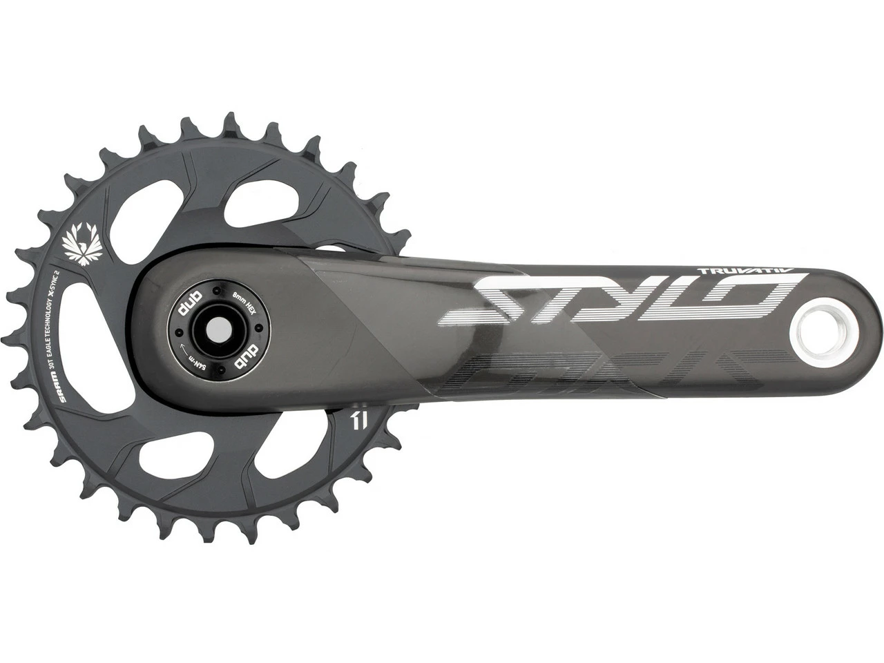 Kurbelarmlänge: 175,0 mmHerstellernummer: 00.6118.528.004Lieferumfang:1 x Kurbelgarnitur Truvativ Stylo 6K Eagle Fat4 Direct Mount DUB1 x Kettenblatt SRAM 30 Zähneohne DUB-Innenlager